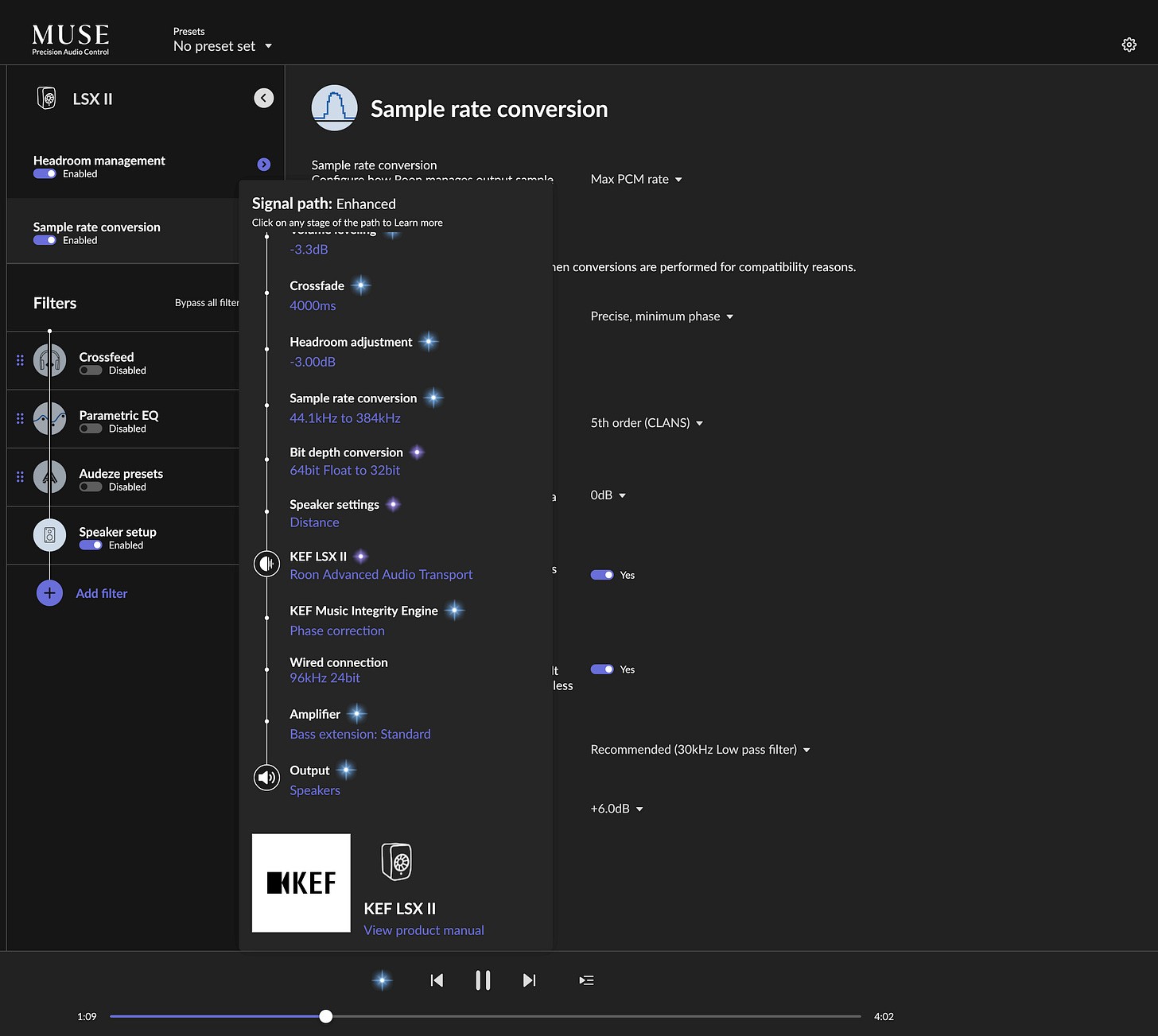 In the middle of this chaotic search, I stumbled across a limitation I hadn’t considered before: the inter-speaker connection between the primary and secondary KEF LSX II speakers. While the primary speaker could accept and process signals up to 384 kHz, the secondary speaker was capped at 96 kHz when using the supplied inter-speaker cable. This was an important realization that, although it didn't completely derail my goals, made me adjust my expectations about achieving a consistent high-resolution experience across both speakers.
